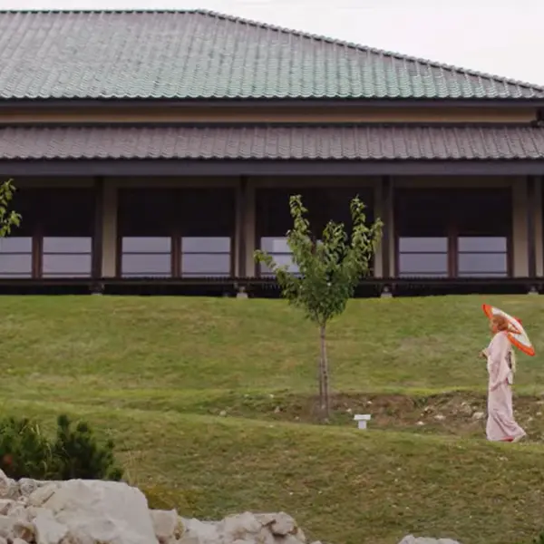 Herbaciarnia znajduje się w pawilonie położonym nad brzegiem zbiornika wodnego, w otoczeniu drzew i krzewów oraz elementów kamiennych ogrodu japońskiego.